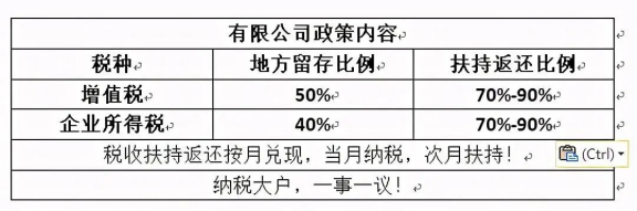 稅收獎勵返還的主要內容就是:在增值稅、企業所得稅的地方留存部分的基礎上,進行70%-90%比例的稅收返還,一是對企業納稅的獎勵;同時也是緩解企業的稅負壓力和減輕企業運營成本,以期待企業做大做強,后期為政府提供更多的稅收收入。